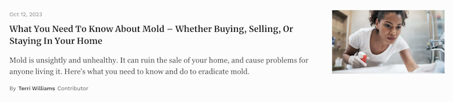 Read the full article here: https://www.forbes.com/sites/terriwilliams/2023/10/12/what-you-need-to-know-about-mold---whether-buying-selling-or-staying-in-your-home/?sh=1aed720d68f9